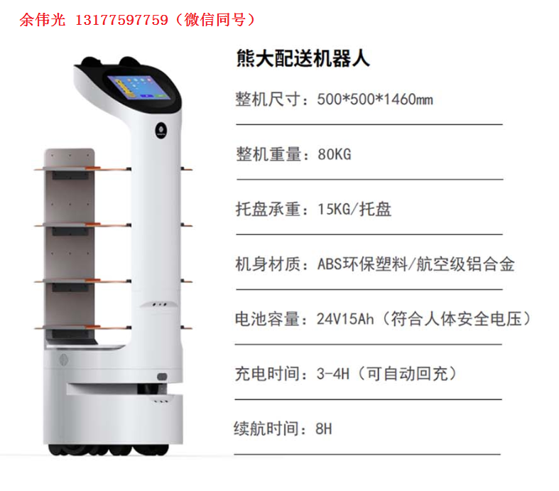 熊大系列W50智能配送机器人 详细信息 熊大系列W50智能配送机器人 江西太空机器人科技有限公司于是江西省鹰潭市创办,由来 自哈工大、浙江大学、同济大学等院校的博士和硕士为技术班底组建而成,核心技术团队有近7年的 服务机器人开发和应用经验;生产管理人员均有十余年电子电气工厂相关工作经历。